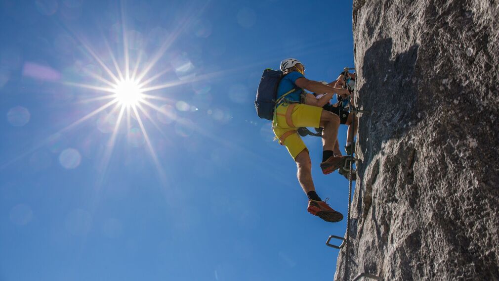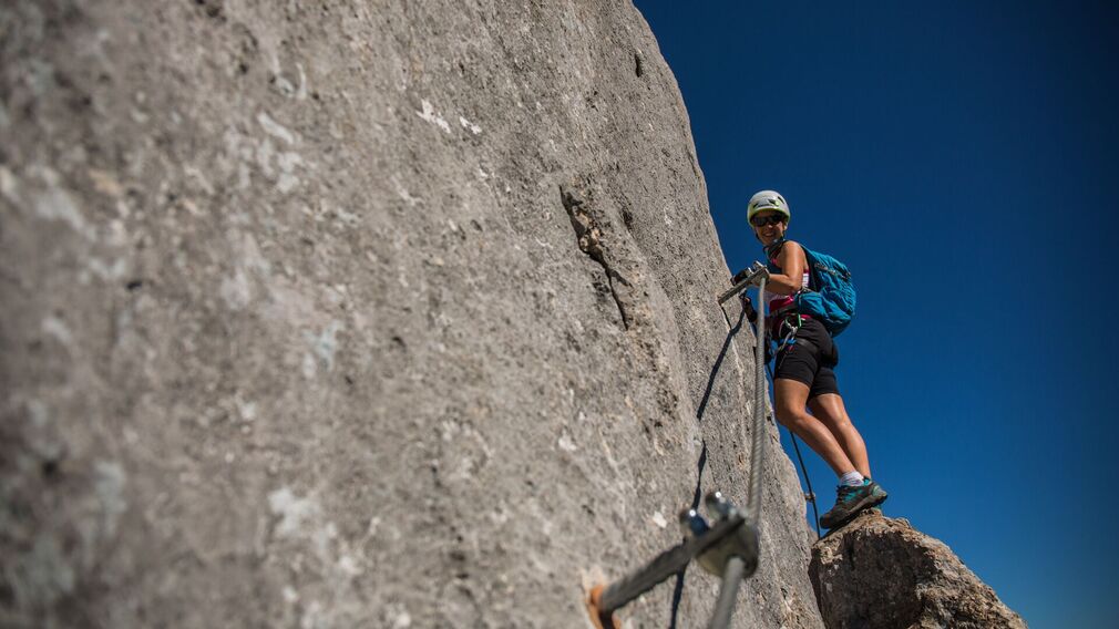 Der Klettersteig an der Seekarlspitze im Rofangebirge führt in den Nordwandbereich und punktet mit atemberaubenden Tiefblicken. Die eindrucksvollste Passage ist gleich zu Beginn die Querung der Nordwand.