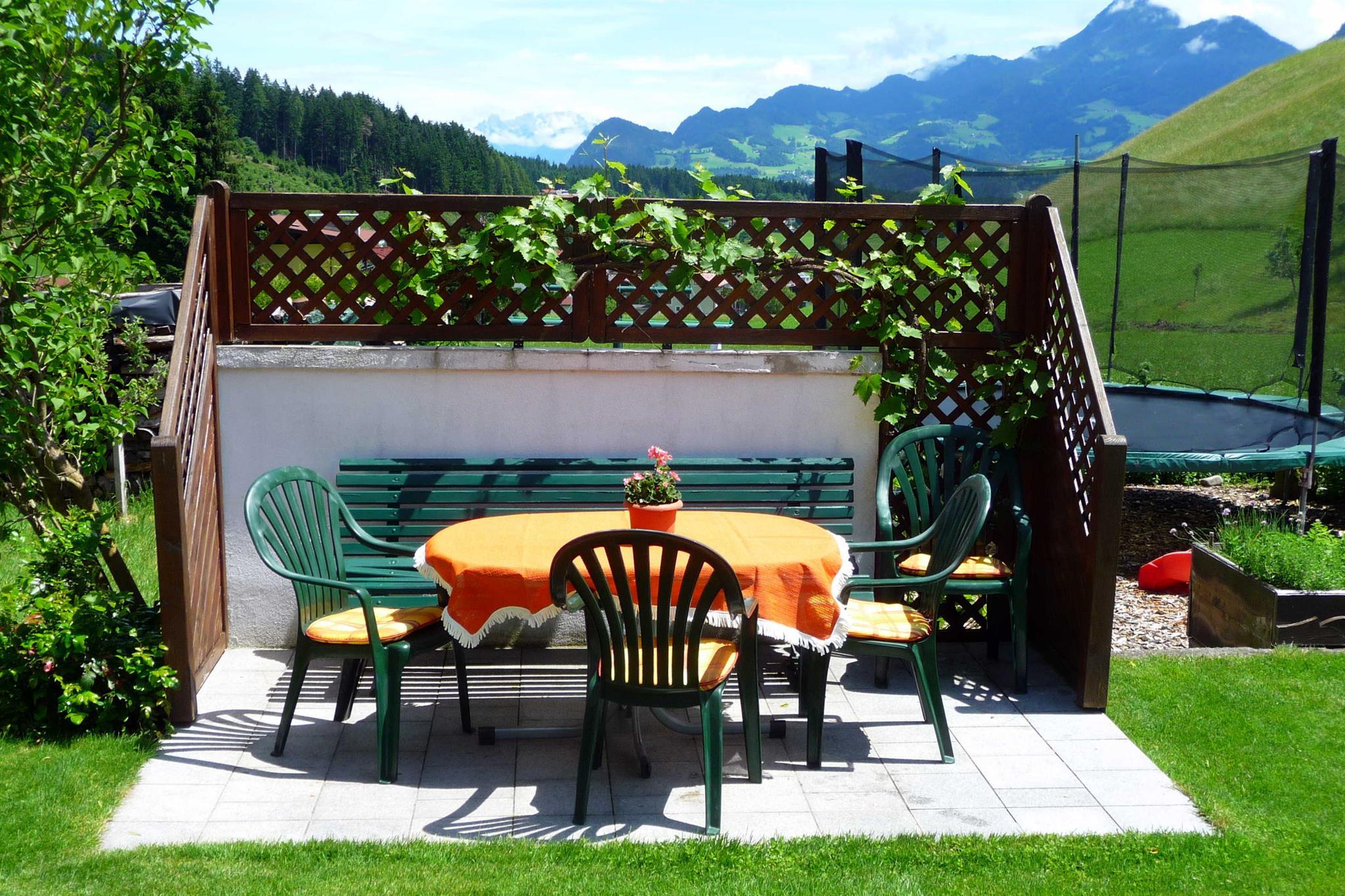 Unsere ländliche Pension bietet Dir mit einem Garten, die perfekte Kulisse für entspannte Stunden im Freien. Genieße die Sonne auf unserer Sonnenterrasse oder bereite köstliche Grillspezialitäten am Grillplatz . Die Liegestühle im Garten laden ein, das Panorama der Alpen zu bewundern, während Du die Natur um Dich herum wahrnimmst.