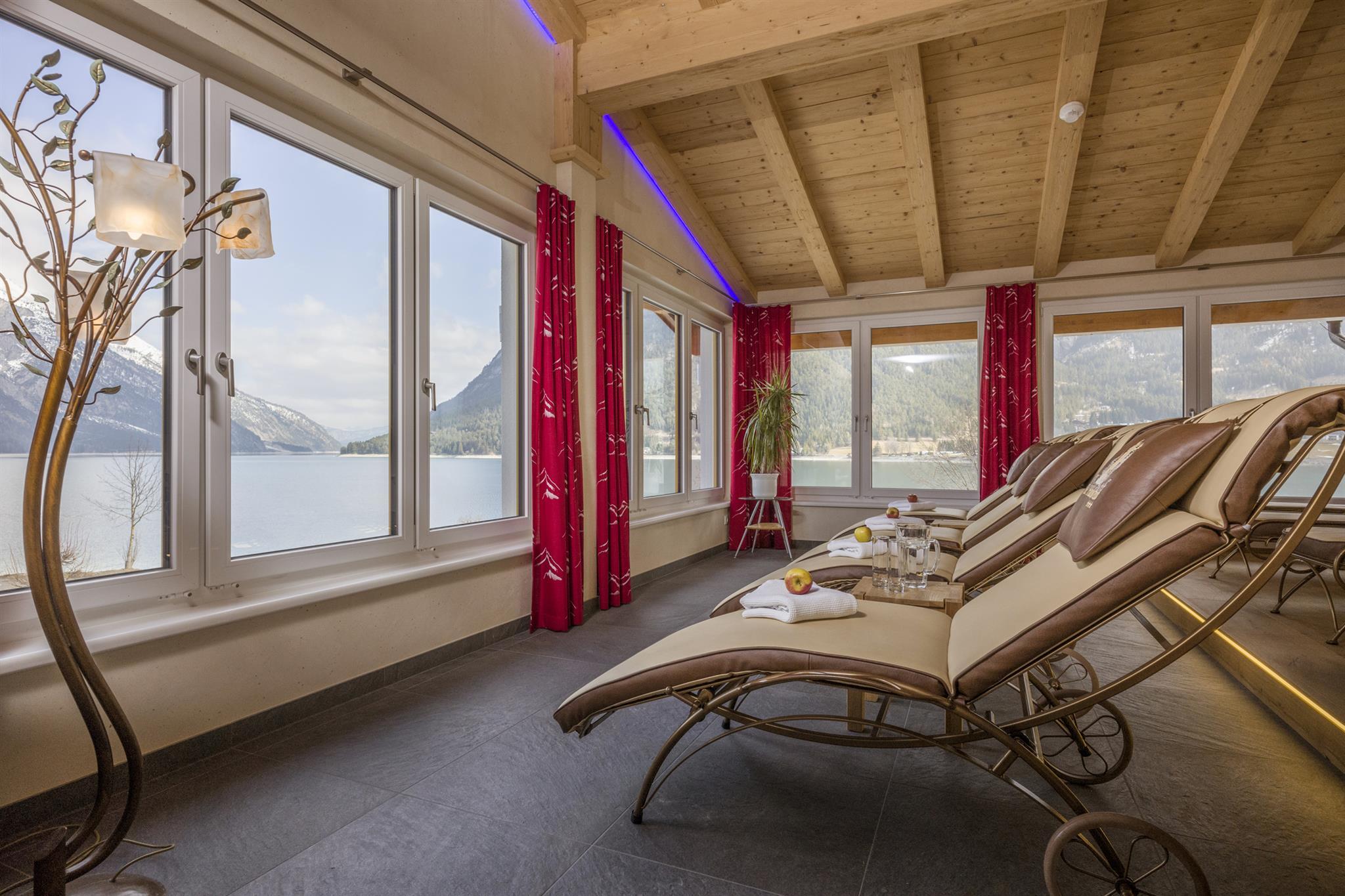 In unserer Panoramasauna können Sie in der finnischen Sauna und in der Infrarotkabine entspannen. Im Ruheraum mit Panoramafenstern genießen Sie einen herrlichen Blick auf den Achensee und die umliegenden Berge.