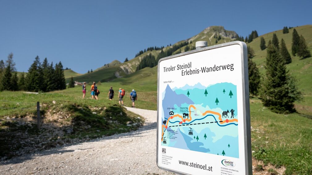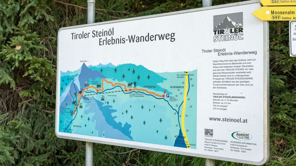As you follow the Tiroler Steinöl themed trail, interpretive signs bring the past to life, showing how miners made their way from Lake Achensee to the remote Bächental valley and hauled the extracted shale oil back with great effort.